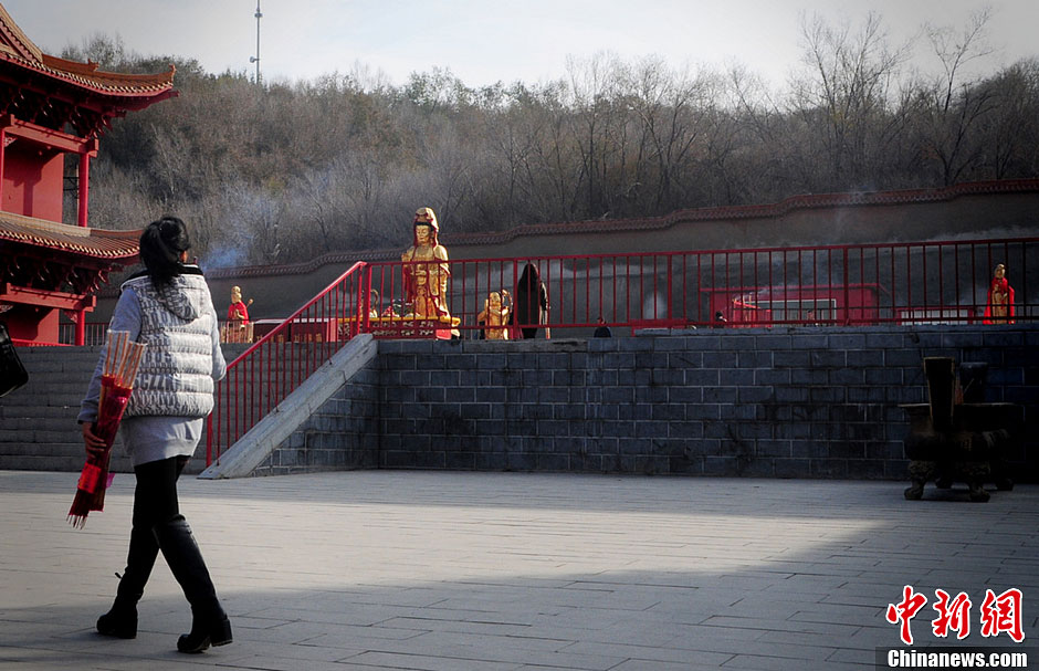 11月7日,记者前往新疆乌鲁木齐清泉寺看到,寺庙已重新开放,善男信女们在寺中烧香拜佛。一个多月前,清泉寺夜遭大火,寺中“大雄宝殿”化为灰烬,所幸无人伤亡。10月4日,22岁的男性纵火者王某被公安机关抓获,王某对犯罪事实供认不讳。图为化为灰烬的“大雄宝殿”变成一片空地。空地上暂时摆着观音像。马新龙 摄