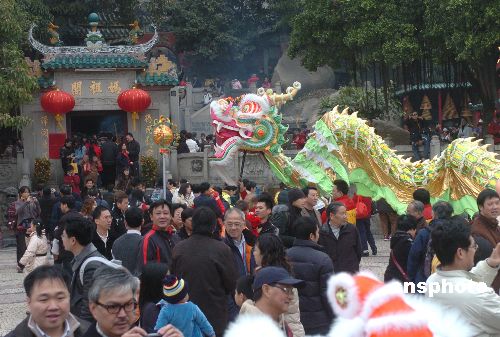 二月十日(大年除四),游客将澳门妈阁庙围得水泄不通。初三之后,大批内地游客来澳门观光度岁,各旅游点游客爆满。中新社发 史利 摄