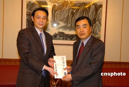 2月27日下午,日本新华侨华人会会长吴智深等来到中国驻日使馆,代表该会向中国雪灾灾区捐款200万日元。据了解,在得知中国部分省市发生雨雪冰冻灾害后,新华人华侨会通过各侨团共募集到超过200万日元的善款,今天将其中的116万日元交到使馆,其他通过日本各地侨团交到当地中国领馆。图为吴智深(左)向中国驻日使馆孔铉佑公使(右)移交捐款。中新社发 滕剑峰 摄