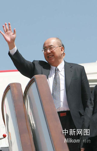 中国国民党主席吴伯雄挥手作别北京。摄影 廖文静