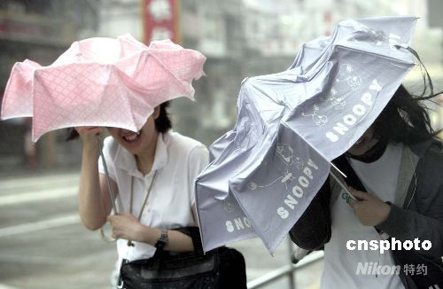 8月22日,香港天文台在早上7时40分发出八号西北烈风信号,预计八号风球将会在今日大部分时间生效。图为市民在狂风暴雨下艰难出行。中新社发 张勤 摄