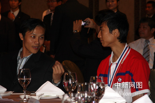 8月26日,在欢迎参加北京奥运返台的中华台北代表团的餐会上,上届奥运跆拳道银牌得主黄志雄与北京奥运跆拳道铜牌得主朱木炎交流经验。朱木炎也是上届奥运跆拳道金牌得主。作者 陈立宇