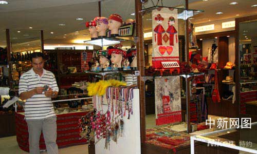 8月31日,台北县原住民族行政局、文化局邀请大陆在台驻点的媒体记者赴大台北地区唯一的原住民乡镇乌来采风,图为乌来那鲁湾温泉饭店中的原住民文化纪念商品区。琳琅满目的工艺品吸引游客观看购买。陈立宇 摄影