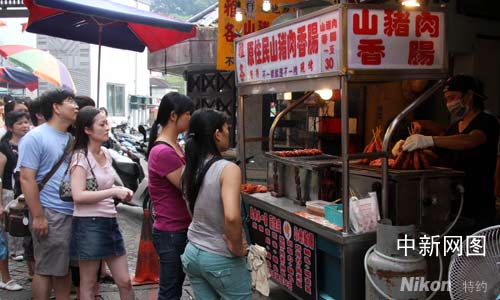8月31日,台北县原住民族行政局、文化局邀请大陆在台驻点的媒体记者赴大台北地区唯一的原住民乡镇乌来采风,图为乌来老街上具原住民特色的山猪肉烤香肠吸引民众排队购买,欲一尝美味。陈立宇 摄影