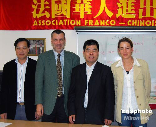 当地时间九月四日下午,法国巴黎市警察局亚裔事务负责人多诺(左二),走访巴黎北郊欧拜赫维利耶市的华人社团,了解华商需求,并称赞当地的华人区整洁干净。中新社发 苏宜 摄