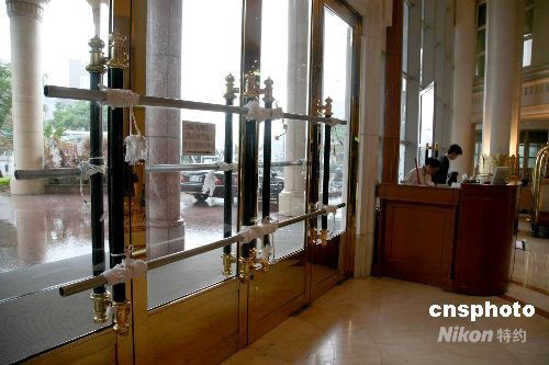 九月二十八日上午,强台风“蔷薇”逼近台湾,台北市上空乌云密布并快速飘动,劲风时紧时缓,雨势时大时小,街头车辆稀少,行人难见踪影。台北市政府已发出警报,并宣布停班停课。台北一家酒店大门里外均用手腕粗的铁管捆牢,并提醒客人出入走侧门。中新社发 杨旭 摄