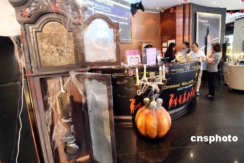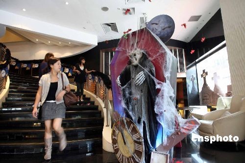 一年一度的万圣节即将到来,在香港闹市街头甚至酒店商场,到处可见摆设中西文化交汇的趣怪装饰,商家借西方节日,营造热闹气氛,招徕顾客。中新社发 洪少葵 摄