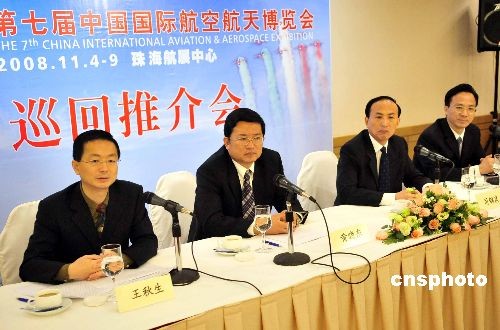 十月十四日,第七届中国国际航空航天博览会在香港举行巡回推介会。本届珠海航展参展国家和地区数量达三十五个,参展的各种飞行器实物超过六十架,近六百家中外航空航天厂商将参展,均大大超过往届。中新社发 谭达明 摄