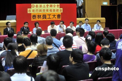 十月二十日,香港工联会早上安排泰林员工与临时清盘人开会,大约二百多人出席。香港有六十二年历史的泰林电器日前全线结业,受影响的员工被拖欠的薪金及遣散费,初步估计多达一千万港元。中新社发 谭达明 摄