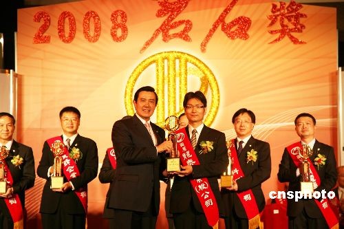 台湾十二家中小企业和六家海外台商企业获二00八年度“磐石奖”,马英九十月二十日下午为获奖企业颁奖。目前台湾共有中小企业一百二十三万七千余家,占台湾企业总数的百分之九十七点六,就业人数近八百万人,占台湾就业人数的百分之七十七。中新社发 杨旭 摄