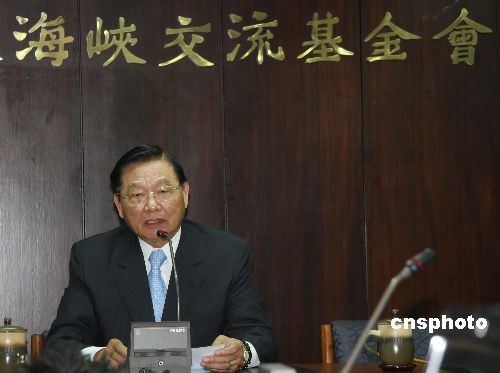 10月21日中午,台湾海基会董事长江丙坤召开临时记者会,谴责暴力袭击来台湾进行学术访问的海协会副会长、厦门大学传播学院院长张铭清。中新社发 耿军 摄