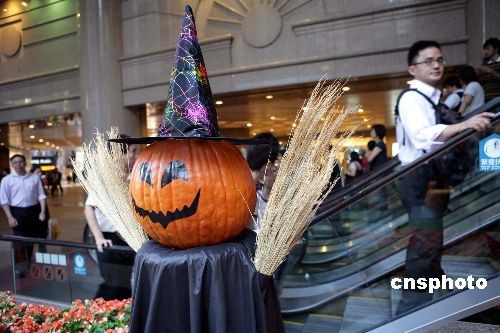 面对金融海啸的影响,近日,香港一些商家纷纷推出一系列万圣节节目,以刺激人流消费。图为香港时代广场设置万圣节装饰,借“鬼”吸客。中新社发 洪少葵 摄