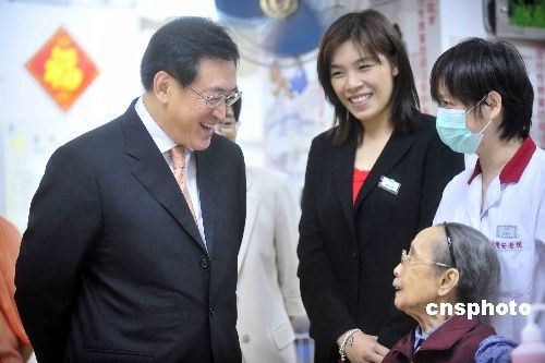 十一月三日上午,香港食物及卫生局局长周一岳,探访一所护老中心,了解政府流行性感冒防疫注射计划的实施情况。特区政府当日开始,为高危人士免费注射流感疫苗。中新社发 谭达明 摄