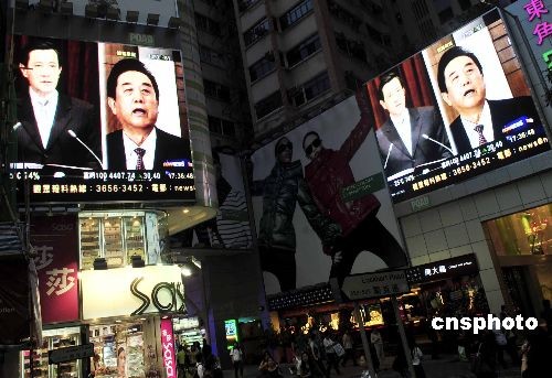 十一月三日,大陆海协会长陈云林率团访台,香港媒体通过大屏幕向市民报导最新消息。中新社发 谭达明 摄