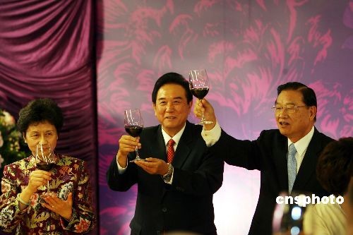十月一月三日晚,台湾海基会董事长江丙坤在101大楼设宴,为中午抵台的海协会会长陈云林洗尘。中新社发 洪少葵 摄