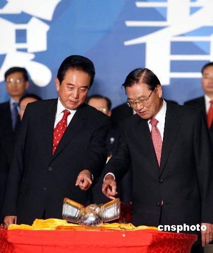 十一月四日,海协会与海基会在台北圆山饭店举行历史性的会谈后,两会领导人陈云林与江丙坤下午两点举行两会签署协议仪式,签署包括空运、海运直航、通邮,以及食品安全等四项协议。图为签署协议后陈云林赠送江丙坤一尊握手形象的雕塑。中新社发 洪少葵 摄