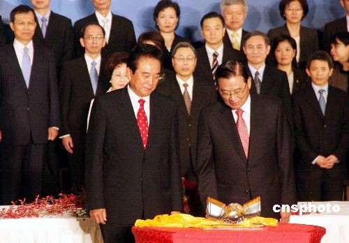 11月4日下午,海协会会长陈云林和海基会董事长江丙坤签署有关两岸空运直航、海运直航、邮政、食品安全的4项协议。图为协议文本签署后,陈云林向江丙坤致赠水晶作品《握手》。中新社发 黄少华 摄