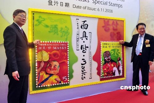 十一月六日,香港邮政举行“中国香港--大韩民国联合发行:‘面具’特别邮票仪式,由署理香港邮政署长陈猷烽及大韩民国驻香港总领事石东演(右)主礼。这一套两枚面值港币五元的邮票,分别印有中国香港的南狮大头佛面具和大韩民国的凤山假面舞面具。中新社发 谭达明 摄