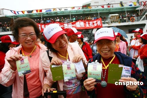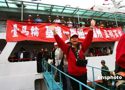 2008年11月8日上午11:30,由马祖经贸文化交流联谊会理事长陈雪生先生带队,马祖、金门及台湾本岛福州乡亲约500人搭乘“台马轮”从台湾基隆经弯靠马祖福澳港后抵达福州港客运码头。此行目的主要是来榕推介马祖旅游及赴大陆各地旅游。此举是两岸扩大“小三通”,特别是11月4日“两会”商谈签署有关协议后,首次实现“两马”海上客运航线延伸至台湾本岛,对福州市进一步拓展与马祖直接往来的范围和层次有重要的意义。同时又是国台办王毅主任9·8期间在厦门举行的“海峡西岸经济区论坛”上受权发布大陆方面五项便利两岸同胞交往的新举措之后,台胞循“两马”航线并对接台湾本岛来榕人数最多的一个团组。马祖经贸文化交流联谊会理事长陈雪生先生、副理事长曹尔忠、陈振清先生等马祖知名人士也随船抵达马尾。据悉,截止今年10月,“两马”航线已运行3782航次,来往旅客达22.93万人次。中新社发 祝敏松 摄