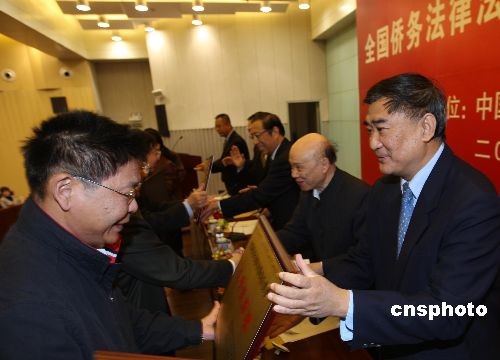 中国侨联副主席李祖沛(右)在北京康铭大厦向全国侨务法律法规知识竞赛获奖者颁奖。
