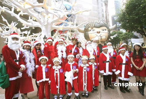 十一月十八日,香港时代广场Carrie Chau的圣诞花园开幕,二十位大大小小、不同年龄的圣诞老人来到露天广场为圣诞花园揭开序幕。中新社发 张勤 摄