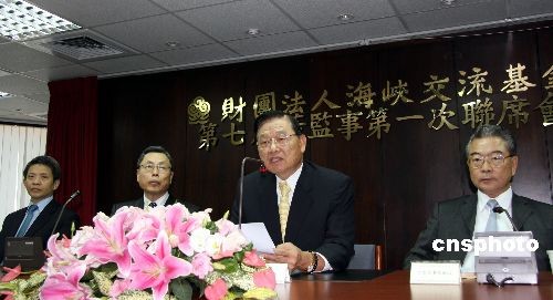 12月2日下午,海峡交流基金会在台北举行第7届董监事会第1次联席会议,江丙坤(右二)经推选续任海基会董事长,高孔廉(左二)、“陆委会”副主委傅栋成(左一)和知名企业家许胜雄(右一)经推举出任海基会副董事长,高孔廉兼任海基会秘书长。中新社发 刘舒凌 摄