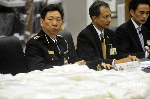香港海关在机场检获历来最大量、俗称“K仔”的氯胺酮,以及俗称“冰”的甲基安非他明,市值超过四千万元。十二月四日,机场科总指挥官谭伟纶、海关助理关长谭耀强及海关毒品调查科高级监督李章荣(左起)在记者会上讲述破案详情。中新社发 谭达明 摄