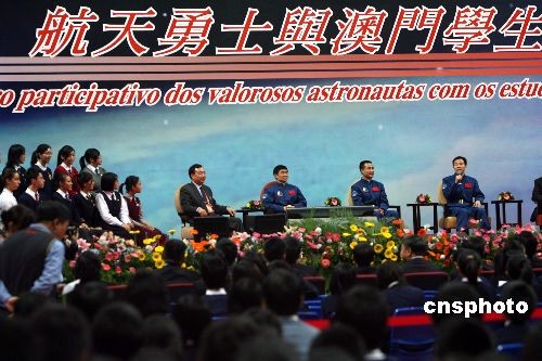 十二月九日,“神舟七号”载人航天飞行代表团一行在澳门理工学院与澳门学生真情对话,分享太空之旅的经过和感想。中新社发 武仲林 摄