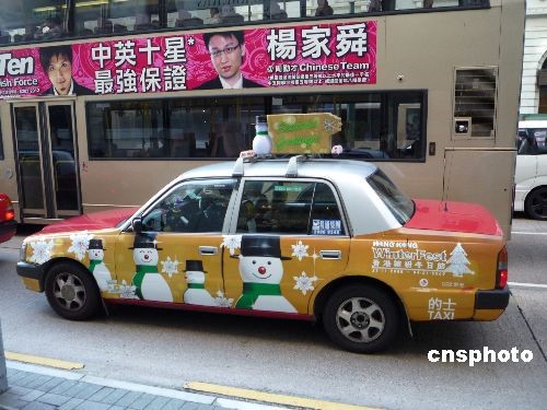 2008年12月20日,香港尖沙咀弥敦道出现“圣诞的士”。随着圣诞节的临近,香港一些出租车在车外壳画上圣诞图画,烘托香港圣诞节氛围。中新社发 姜纯 摄