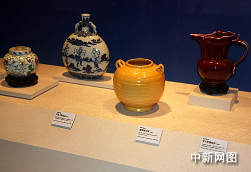 近日,为推广台北故宫“周末夜”活动,台北故宫博物院在台北火车站设置长箱型玻璃广告廊,以高仿真度的馆藏文物进行宣介。图为展示的仿明代前期官营作坊的瓷器。 中新社记者 陈立宇 摄