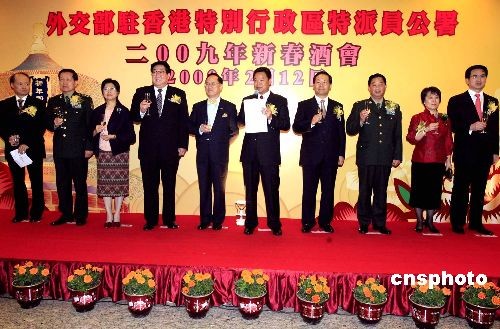 二月十二日,外交部驻香港特别行政区特派员公署举行新春酒会。香港特区行政长官曾荫权、中央政府驻港联络办主任高祀仁、驻港部队司令张仕波、政委刘良凯等特区政府官员、行政会议成员、立法会议员、港区人大代表和政协委员及各界知名人士近五百人出席了酒会。中新社发 张勤 摄