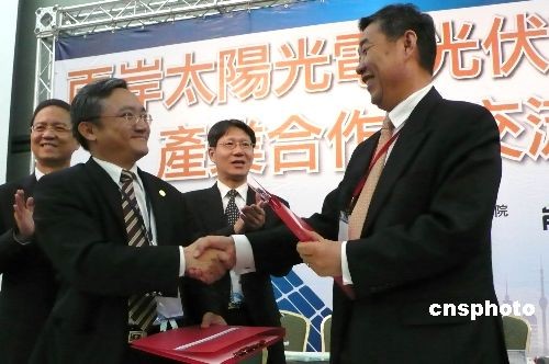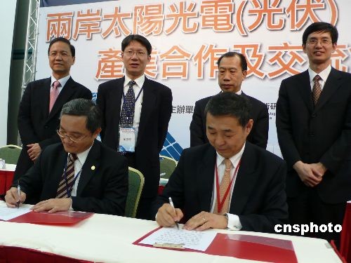 国家发改委能源研究所副所长李俊峰(右)和台湾太阳光电产业协会理事长蓝崇文(左)共同签署两岸合作意向书。