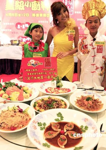 四月八日,来自四川十四岁“中华小厨神”黄文可(右)及来自山西的十岁“妙手小厨王”孙榭君首次来到香港敬献厨技,现场制作的“水煮肉片”、“中华紫荆”、“心相印”等菜式,以纪念“汶川大地震一周年”。图为黄文可、孙榭君与嘉宾香港红星赵硕之合影。中新社发 张勤 摄