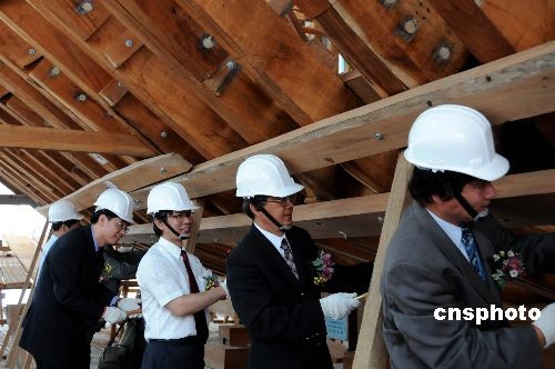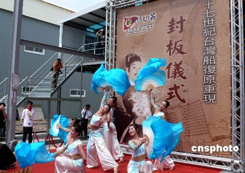 四月三十日上午,郑成功文化节十七世纪台湾船复原重现封板仪式,在台南市林默娘公园旁的台湾船复原重现基地举行,来自大陆的四位嘉宾与台南市长许添财等一同为台湾船钉上第一片外板。中新社发 邓敏 摄
