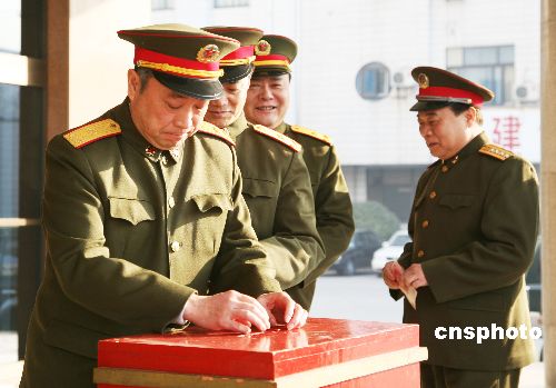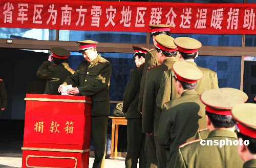 2月4日上午,山东省军区机关为南方雪灾地区群众献爱心捐助仪式在济南举行。省军区司令员谈文虎、政委张秉德等领导出席捐助仪式并带头捐款。中新社发 卢军 摄