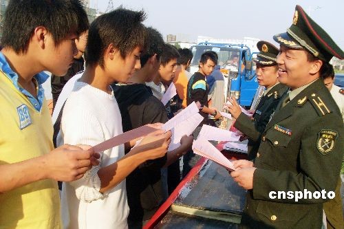 10月15日,江苏省镇江市润州区人武部干部在向第三职教中心的学生宣传征兵新政策。当日,江苏省镇江市润州区人武部干部分别走进辖区内的镇江市第三职教中心和江苏科技大学,结合今年冬季征兵新政策,重点面向大学和高中的应届毕业生开展征兵宣传,鼓励广大学子积极应征入伍,为祖国的国防建设出力。中新社发 石玉成 摄
