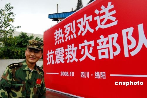 10月19日,最后一支坚守北川的部队——成都军区驻滇某集团军防化团圆满完成任务开始撤离灾区。成都军区驻滇某集团军防化团是“5.12”抗震救灾救援结束后进驻灾区进行防疫消毒、预防和扑灭可能发生疫情的主力部队,是迄今在灾区坚守时间最长的部队。18日开始,部队开始分批次陆续撤离,沿途绵阳各界群众前来送行,向他们为灾区作出的贡献表示感谢。中新社发 胥辉 摄