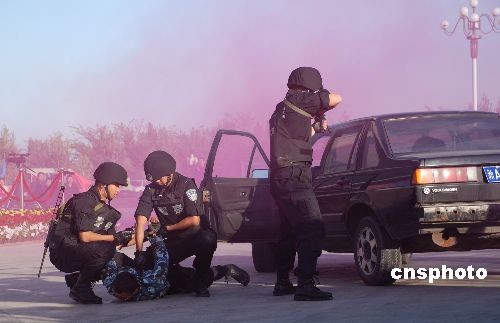 图为特勤大队民警演习中制服一名“嫌疑人”。
