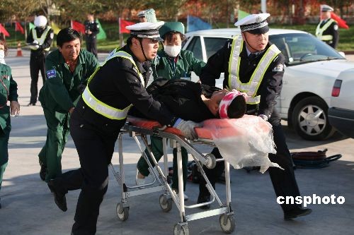 10月21日,新疆高等级公路交警支队进行建队十年来规模最大的一次快速应对高速路突发事件演习。中新社发 宋大勇 摄