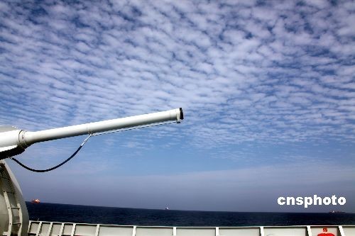 2009年4月3日,中国海军护航编队“海口”号导弹驱逐舰在亚丁湾海域护航商船航行,舰上主炮威风凛凛。中新社发 孙自法 摄