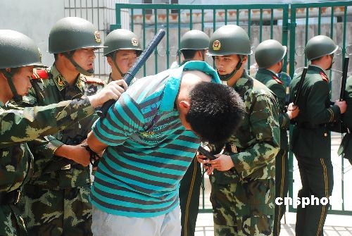 4月15日,海警官兵在处置“暴力袭警”演练中将一名主要“歹徒”制服。 连日来,浙江边防总队海警二支队组织部队进行处置“暴力袭警”演练。海警二支队根据部队所处的重要位置和所担负的特殊任务,始终将暴力袭警处突演练工作摆在重要位置,以增强执勤人员的敌情观念和快速反应能力。中新社发 陈勇 摄