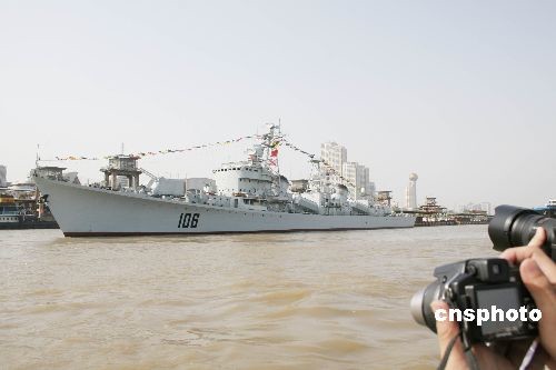 2009年4月22日,停泊在长江武汉段退役的106舰悬挂旗帜,庆祝中国人民解放军海军成立60周年。退役的106舰为长江上首艘停泊内河港口的大型驱逐舰,是我国第一代自主研制的导弹驱逐舰,现落户武汉,供海军工程大学教学训练使用。中新社发 熊峰 摄