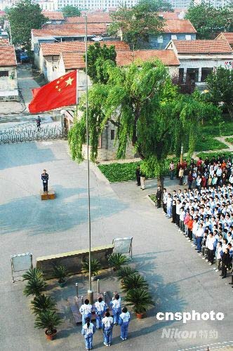 5月19日,山东邹平县实验中学降半旗为四川地震中的遇难者致哀。国务院公告从19日到21日为全国哀悼日,各地降半旗致哀。中新社发 董乃德 摄