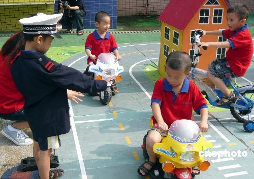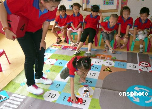 9月9日,重庆数家幼儿园迎来2008全国儿童交通安全训练营活动,旨在通过寓教于乐的方式,帮助儿童掌握基础交通安全知识,提高交通安全意识和自我保护能力。图为小朋友们通过游戏学习简单交通标志和安全知识。中新社发 郭晋嘉 摄
