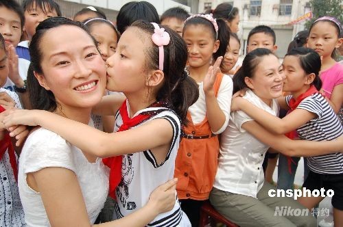9月9日,安徽阜阳市清河路第一小学的小学生快乐地拥抱着老师并送去亲吻,祝福老师教师节快乐。中新社发 王彪 摄