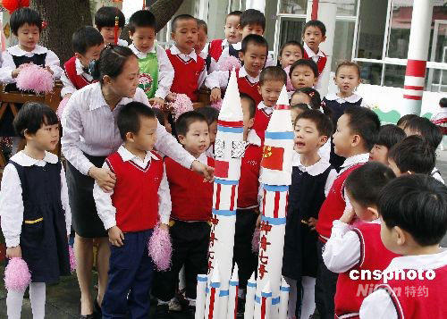 9月28日,为了激发孩子们对航天科技的关注,培养对科学科技的兴趣,江苏省无锡市侨谊幼儿园的孩子们开展了“我与‘神七’共翱翔” 主题活动。中新社发 张浩 摄