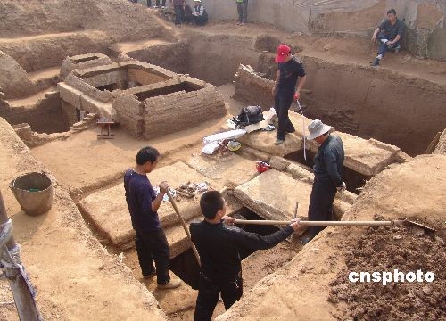 10月15日,考古人员正在挖掘汉墓。近日,在山东省沂南县砖埠镇发现占地约3000平方米的东汉家族墓葬群,经过上级部门批准,考古人员对其中两座墓穴进行了抢救性科学挖掘,目前已经发掘出土8件釉陶壶在内的大量文物,墓内石壁上有多幅画像,清晰可见。中新社发 杜昱葆 摄