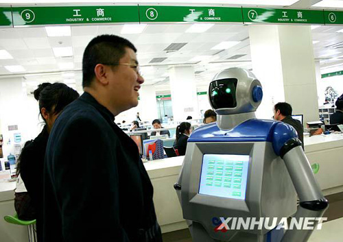 10月20日,一种智能迎宾机器人在沈阳市行政审批服务中心“上岗”。这种机器人集自主行走、自动避障、遥控操作、语音交互等功能于一身。机器人身高1.6米,宽0.7米,重达50公斤。
