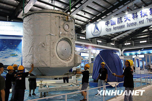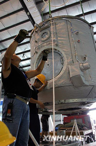 10月30日,工作人员将“神七”轨道舱吊装到展台上。新华社发 李建束 摄