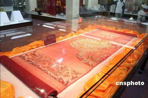 11月3日,红四合如意云纹地妆花纱袍料在南京云锦博物馆展出。这件云锦采用装金、装彩、装孔雀羽毛的独特工艺,织品长17米、重900克,织有17条形态与颜色各异的龙。据悉,该袍料是根据北京十三陵出土的明万历皇帝方补龙袍复制的珍品,由南京云锦研究所历时5年完成,它恢复了失传300多年的“纱地妆花织金”工艺,被誉为南京云锦博物馆的“镇馆之宝”,目前世界仅存两件。中新社发 胡高华 摄